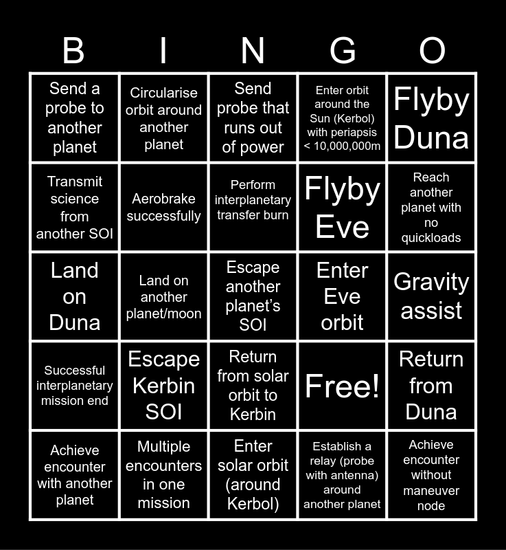 This bingo card has 25 words: Escape Kerbin SOI, Enter solar orbit (around Kerbol), Perform interplanetary transfer burn, Achieve encounter with another planet, Flyby Duna, Send a probe to another planet, Transmit science from another SOI, Circularise orbit around another planet, Enter Eve orbit, Return from solar orbit to Kerbin, Flyby Eve, Land on Duna, Free!, Return from Duna, Aerobrake successfully, Achieve encounter without maneuver node, Gravity assist, Send probe that runs out of power, Reach another planet with no quickloads, Land on another planet/moon, Escape another planet’s SOI, Multiple encounters in one mission, Successful interplanetary mission end, Enter orbit around the Sun (Kerbol) with periapsis < 10,000,000m and Establish a relay (probe with antenna) around another planet.