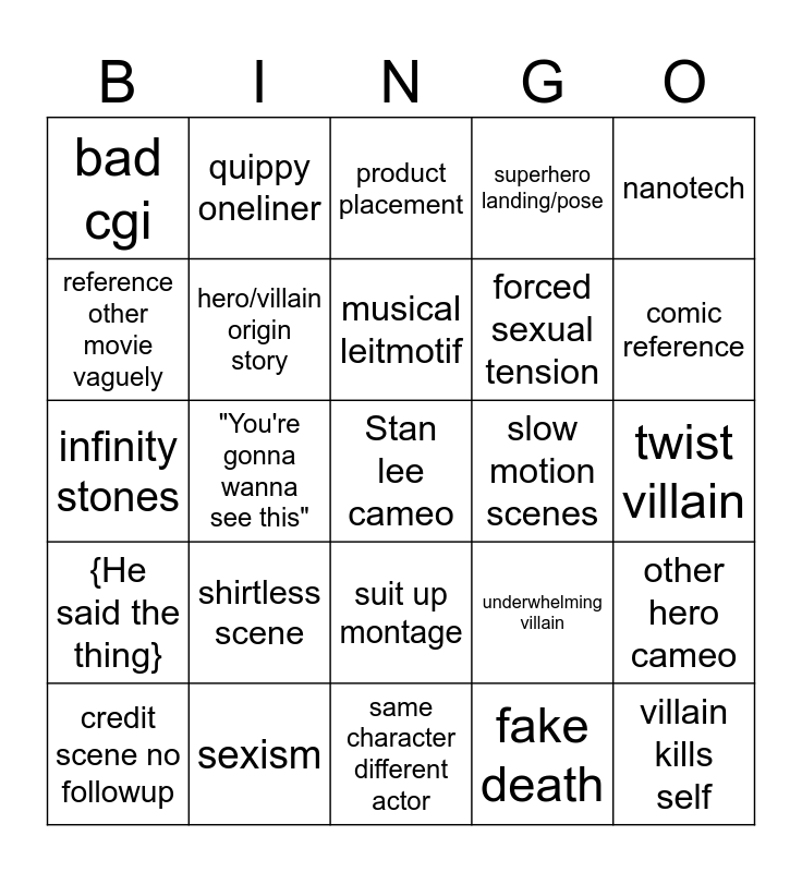 This bingo card has a free space and 24 words: shirtless scene, sexism, musical leitmotif, credit scene no followup, nanotech, bad cgi, reference other movie vaguely, quippy oneliner, slow motion scenes, suit up montage, forced sexual tension, infinity stones, underwhelming villain, other hero cameo, hero/villain origin story, fake death, twist villain, product placement, comic reference, "You're gonna wanna see this", villain kills self, {He said the thing}, superhero landing/pose and same character different actor.