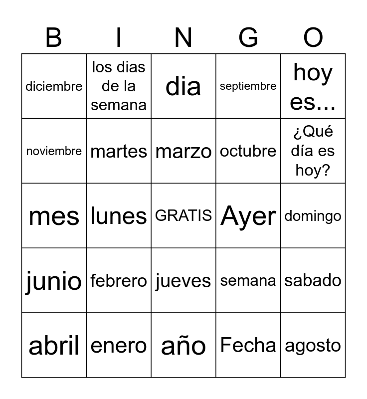 This bingo card has a free space and 32 words: Fecha, los meses del ano, lunes, mes, junio, martes, hoy es..., sabado, los dias de la semana, viernes, marzo, dia, mañana, julio, Ayer, miercoles, abril, mes, jueves, febrero, semana, mayo, domingo, enero, agosto, septiembre, octubre, noviembre, diciembre, año, fin de semana and ¿Qué día es hoy?.