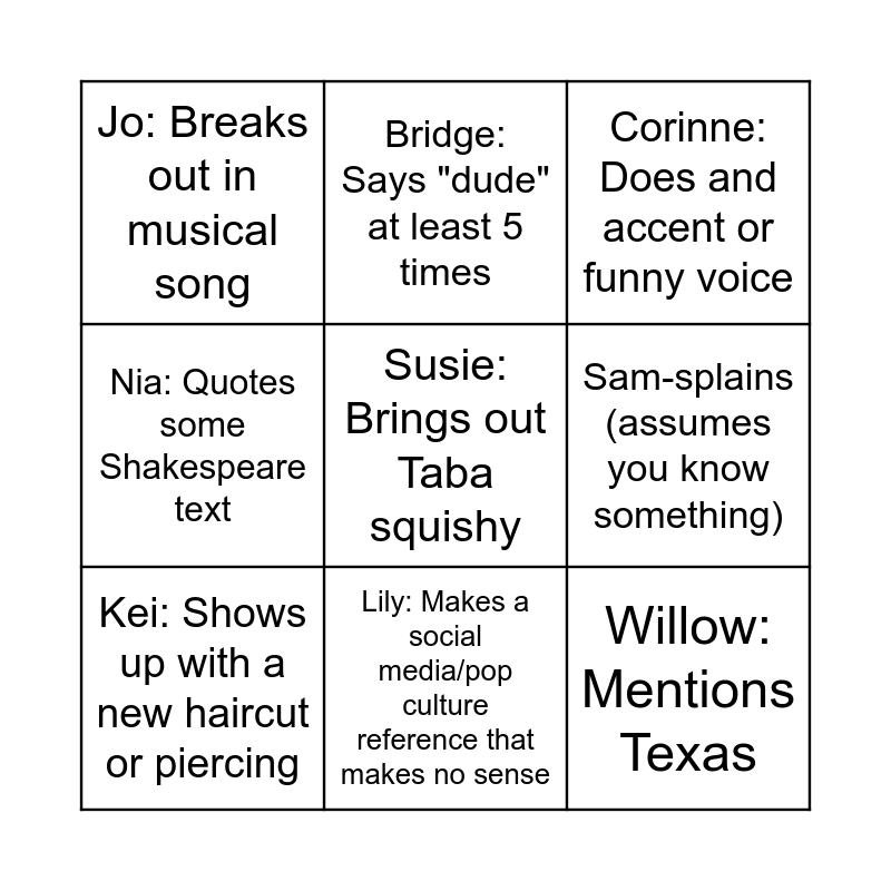 This bingo card has a free space and 8 words: Sam-splains (assumes you know something), Corinne: Does and accent or funny voice, Bridge: Says "dude" at least 5 times, Kei: Shows up with a new haircut or piercing, Jo: Breaks out in musical song, Willow: Mentions Texas, Nia: Quotes some Shakespeare text and Lily: Makes a social media/pop culture reference that makes no sense.