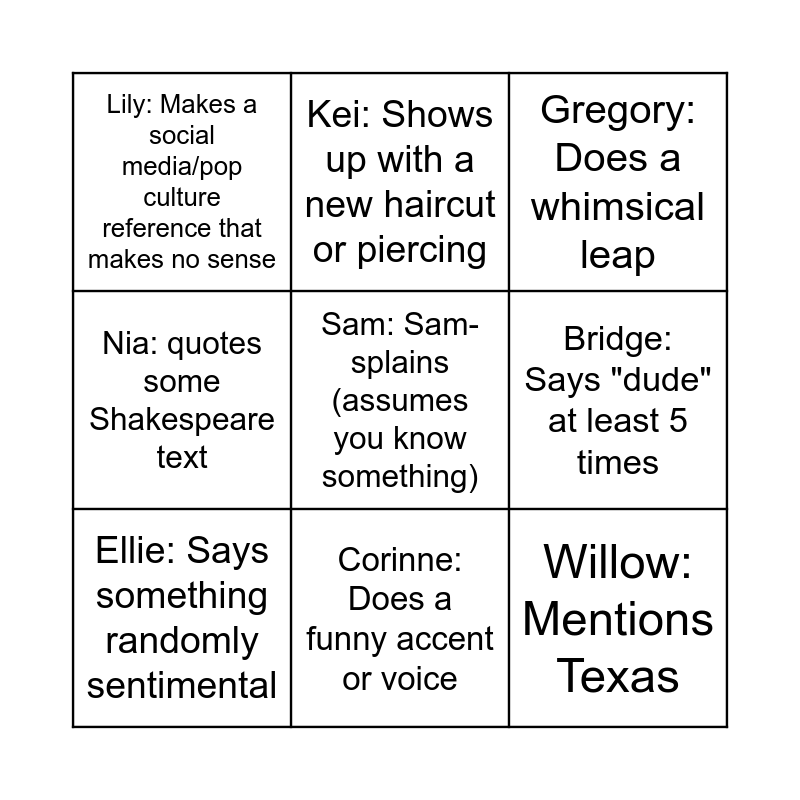 This bingo card has a free space and 8 words: Bridge: Says "dude" at least 5 times, Gregory: Does a whimsical leap, Kei: Shows up with a new haircut or piercing, Ellie: Says something randomly sentimental, Lily: Makes a social media/pop culture reference that makes no sense, Willow: Mentions Texas, Nia: quotes some Shakespeare text and Corinne: Does a funny accent or voice.
