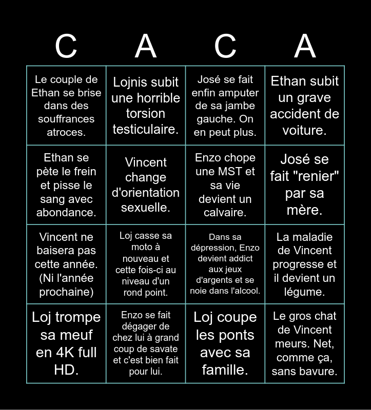 This bingo card has 16 words: Enzo se fait dégager de chez lui à grand coup de savate et c'est bien fait pour lui., La maladie de Vincent progresse et il devient un légume., José se fait enfin amputer de sa jambe gauche. On en peut plus., Le couple de Ethan se brise dans des souffrances atroces., Vincent ne baisera pas cette année. (Ni l'année prochaine), Lojnis subit une horrible torsion testiculaire., Dans sa dépression, Enzo devient addict aux jeux d'argents et se noie dans l'alcool., Loj coupe les ponts avec sa famille., Ethan se pète le frein et pisse le sang avec abondance., Vincent change d'orientation sexuelle., Loj trompe sa meuf en 4K full HD., Ethan subit un grave accident de voiture., Loj casse sa moto à nouveau et cette fois-ci au niveau d'un rond point., José se fait "renier" par sa mère., Enzo chope une MST et sa vie devient un calvaire. and Le gros chat de Vincent meurs. Net, comme ça, sans bavure..