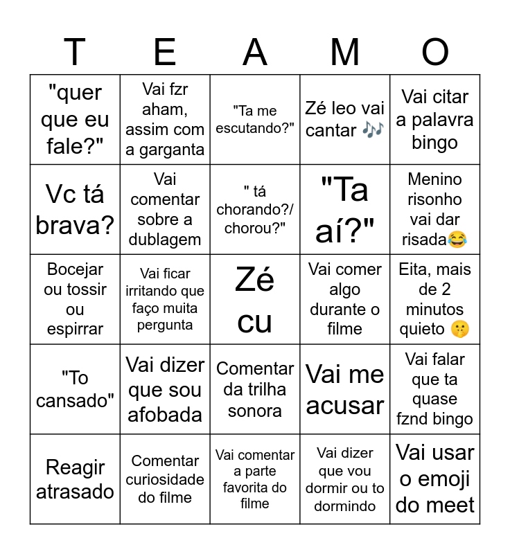 This bingo card has a free space and 24 words: Vai dizer que sou afobada, Comentar curiosidade do filme, " tá chorando?/ chorou?", Reagir atrasado, Vai citar a palavra bingo, "quer que eu fale?", Vc tá brava?, Vai fzr aham, assim com a garganta, Vai comer algo durante o filme, Comentar da trilha sonora, "Ta aí?", Bocejar ou tossir ou espirrar, Vai me acusar, Vai falar que ta quase fznd bingo, Vai comentar sobre a dublagem, Vai dizer que vou dormir ou to dormindo, Eita, mais de 2 minutos quieto 🤫, "Ta me escutando?", Menino risonho vai dar risada😂, Vai ficar irritando que faço muita pergunta, Vai usar o emoji do meet, "To cansado", Zé leo vai cantar 🎶 and Vai comentar a parte favorita do filme.