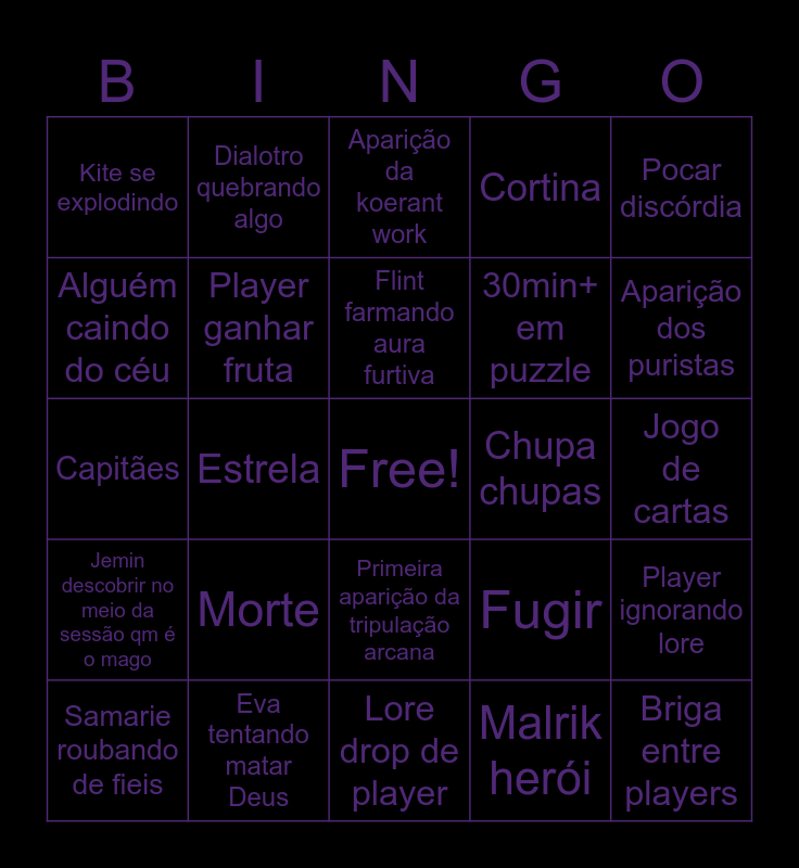 This bingo card has a free space and 24 words: Morte, Eva tentando matar Deus, Flint farmando aura furtiva, Samarie roubando de fieis, Pocar discórdia, Kite se explodindo, Alguém caindo do céu, Dialotro quebrando algo, Chupa chupas, Primeira aparição da tripulação arcana, 30min+ em puzzle, Capitães, Fugir, Player ignorando lore, Player ganhar fruta, Malrik herói, Jogo de cartas, Aparição da koerant work, Aparição dos puristas, Estrela, Briga entre players, Jemin descobrir no meio da sessão qm é o mago, Cortina and Lore drop de player.
