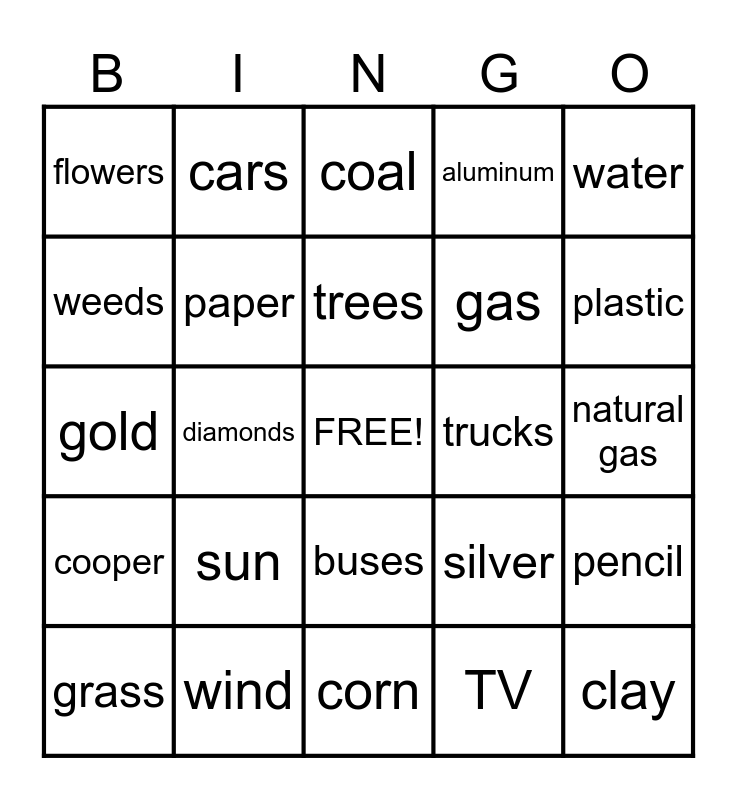 This bingo card has a free space and 24 words: sun, wind, trees, grass, water, flowers, weeds, cars, trucks, buses, gas, gold, silver, pencil, paper, TV, natural gas, coal, plastic, diamonds, clay, cooper, aluminum and corn.