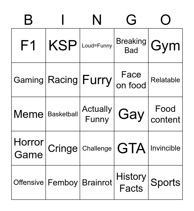 This bingo card has a free space and 24 words: Cringe, Femboy, Furry, Offensive, Gym, F1, Gaming, KSP, Gay, Challenge, Face on food, Meme, GTA, Invincible, Racing, History Facts, Food content, Loud=Funny, Relatable, Basketball, Sports, Horror Game, Breaking Bad and Brainrot.