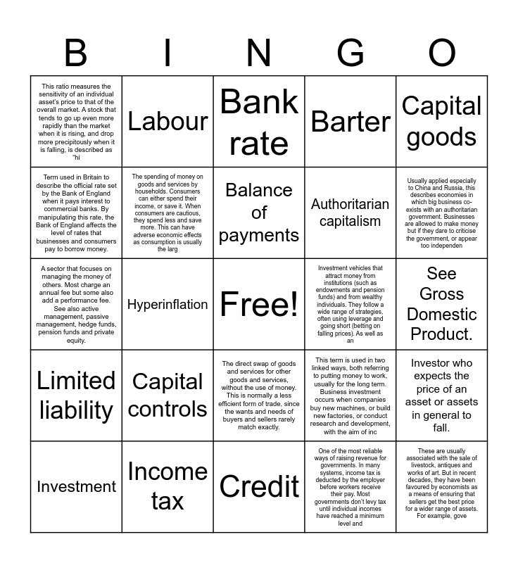 This bingo card has a free space and 50 words: Asset stripping, These are usually associated with the sale of livestock, antiques and works of art. But in recent decades, they have been favoured by economists as a means of ensuring that sellers get the best price for a wider range of assets. For example, gove, Liabilities, Credit, Capital controls, Manufacturing, Labour, Cryptocurrency, Term used in Britain to describe the official rate set by the Bank of England when it pays interest to commercial banks. By manipulating this rate, the Bank of England affects the level of rates that businesses and consumers pay to borrow money., Investment management, The spending of money on goods and services by households. Consumers can either spend their income, or save it. When consumers are cautious, they spend less and save more. This can have adverse economic effects as consumption is usually the larg, Barter, Investor who expects the price of an asset or assets in general to fall., This term is used in two linked ways, both referring to putting money to work, usually for the long term. Business investment occurs when companies buy new machines, or build new factories, or conduct research and development, with the aim of inc, One of the most important concepts in modern capitalism. Limited liability means that investors who own the equity of a company can only lose their initial stake if the business collapses; creditors cannot pursue their other assets, such as thei, The cause that led to the founding of The Economist in 1843. Free-trade enthusiasts believe that the unfettered international exchange of goods and services leads to more efficient economies (see comparative advantage) and thus, in the long run,, Balance of payments, Investment vehicles that attract money from institutions (such as endowments and pension funds) and from wealthy individuals. They follow a wide range of strategies, often using leverage and going short (betting on falling prices). As well as an, GDP, Capital goods, Hyperinflation, One of the most reliable ways of raising revenue for governments. In many systems, income tax is deducted by the employer before workers receive their pay. Most governments don’t levy tax until individual incomes have reached a minimum level and, This ratio measures the sensitivity of an individual asset’s price to that of the overall market. A stock that tends to go up even more rapidly than the market when it is rising, and drop more precipitously when it is falling, is described as “hi, Authoritarian capitalism, The practice of buying a company and rapidly selling off the component parts with the aim of making a profit. This often leads to great disruption in the business and a loss of jobs., Auctions, Usually applied especially to China and Russia, this describes economies in which big business co-exists with an authoritarian government. Businesses are allowed to make money but if they dare to criticise the government, or appear too independen, A term used to describe a country’s transactions with the rest of the world. The import and export of goods and services are captured in the current account, which also includes investment income and transfers (such as expatriate workers sending, Bank rate, The direct swap of goods and services for other goods and services, without the use of money. This is normally a less efficient form of trade, since the wants and needs of buyers and sellers rarely match exactly., Bear, Regulations designed to prevent money from moving across borders. They are often used in regimes with a fixed exchange rate; by preventing money from flowing abroad, they protect the domestic currency from depreciation. Capital controls were a ke, Consumption, When inflation gets out of control—as happened, for example, in Germany in 1923. A loaf of bread cost 200bn marks in November 1923 and workers were paid twice a day because their wages fell in value during the day. Such high rates of inflation ar, Income tax, A catch-all term for the extension of loans to individuals, companies or organisations. The term is also used more generally to refer to the total amount of debt in an economy, as in credit crunch and credit expansion. More narrowly, a credit is, Hedge funds, Beta, The places where money is invested, in the form of short-term loans, bonds, equities and derivatives. Often anthropomorphised in the media (eg, “The markets were unhappy with the government’s budget plans”)., See Gross Domestic Product., Financial markets, Tokens created digitally and at the moment privately, although some central banks have created their own (see this article). Enthusiasts see the currencies as a way of avoiding fiat currency and hence the oversight of governments and banks; owne, Free trade, Physical assets that companies use in the manufacturing process., Investment, A sector that focuses on managing the money of others. Most charge an annual fee but some also add a performance fee. See also active management, passive management, hedge funds, pension funds and private equity., A term used for both a factor for production and for the organised representatives of the working classes (trade unions and some political parties). The supply of labour is an important determinant of economic growth, and the shrinking of the wo, Something owed to others, and the other side of the balance-sheet from assets. Often, this is in the form of money, such as a debt. But it could be a warranty to repair or replace a product that the company has sold or the legal costs involved in, Limited liability and The process of making physical products from raw materials through the use of labour and machinery. Once dominant in developed economies, it now takes a smaller share of GDP than services. That is unlikely to be reversed: see this Explainer..