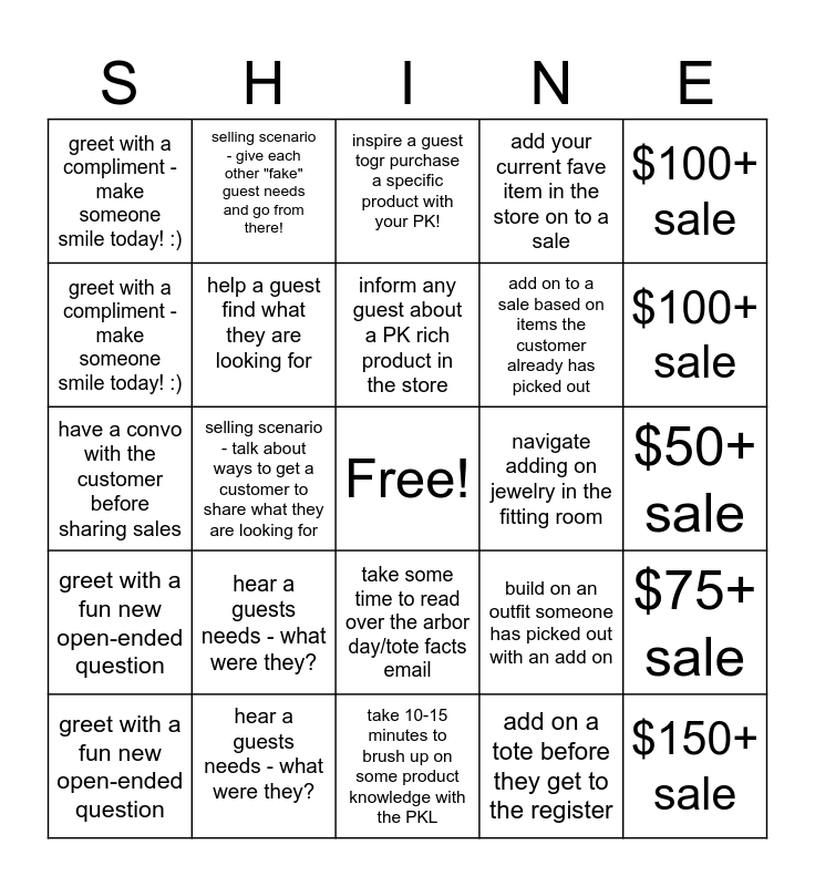 ⚠ This card has duplicate items: greet with a fun new open-ended question (2), $100+ sale (2), greet with a compliment - make someone smile today! :) (2)