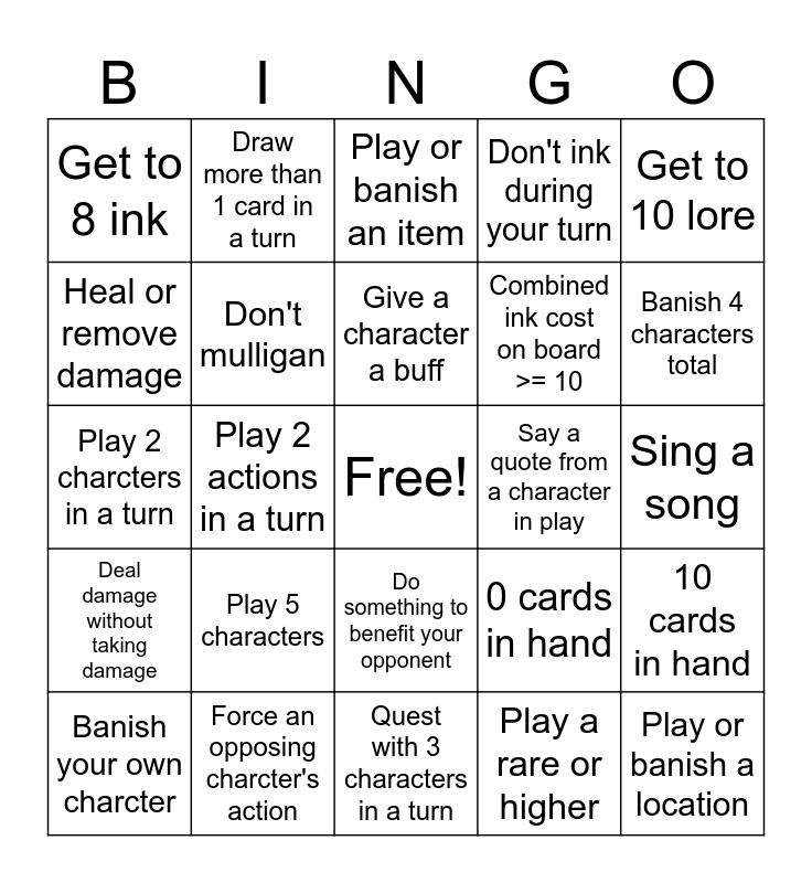 This bingo card has a free space and 24 words: Play 5 characters, Force an opposing charcter's action, Give a character a buff, Banish your own charcter, Get to 10 lore, Get to 8 ink, Heal or remove damage, Draw more than 1 card in a turn, Say a quote from a character in play, Do something to benefit your opponent, Combined ink cost on board >= 10, Play 2 charcters in a turn, 0 cards in hand, 10 cards in hand, Don't mulligan, Play a rare or higher, Sing a song, Play or banish an item, Banish 4 characters total, Play 2 actions in a turn, Play or banish a location, Deal damage without taking damage, Don't ink during your turn and Quest with 3 characters in a turn.