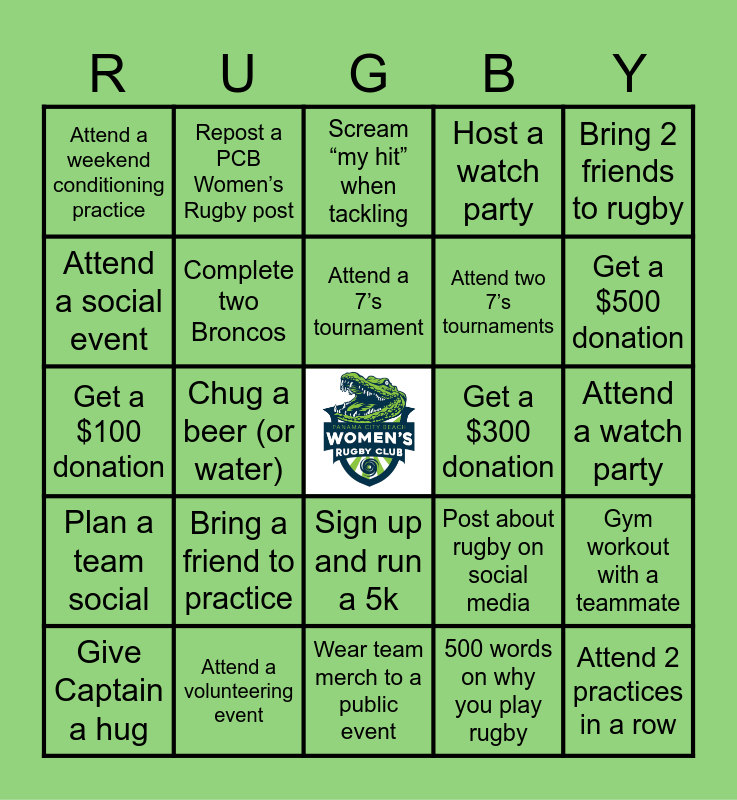 This bingo card has a free space and 24 words: Bring a friend to practice, Attend a volunteering event, Attend a 7’s tournament, Give Captain a hug, Bring 2 friends to rugby, Attend a weekend conditioning practice, Attend a social event, Repost a PCB Women’s Rugby post, Get a $300 donation, Sign up and run a 5k, Attend two 7’s tournaments, Get a $100 donation, Post about rugby on social media, Gym workout with a teammate, Complete two Broncos, 500 words on why you play rugby, Attend a watch party, Scream “my hit” when tackling, Get a $500 donation, Chug a beer (or water), Attend 2 practices in a row, Plan a team social, Host a watch party and Wear team merch to a public event.