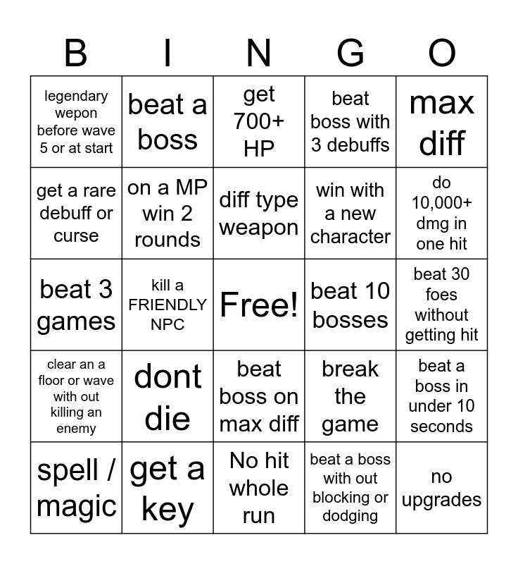 This bingo card has a free space and 24 words: dont die, get a key, diff type weapon, spell / magic, max diff, legendary wepon before wave 5 or at start, get a rare debuff or curse, beat a boss, beat 10 bosses, beat boss on max diff, win with a new character, beat 3 games, break the game, beat a boss in under 10 seconds, on a MP win 2 rounds, beat a boss with out blocking or dodging, beat 30 foes without getting hit, get 700+ HP, do 10,000+ dmg in one hit, kill a FRIENDLY NPC, no upgrades, clear an a floor or wave with out killing an enemy, beat boss with 3 debuffs and No hit whole run.