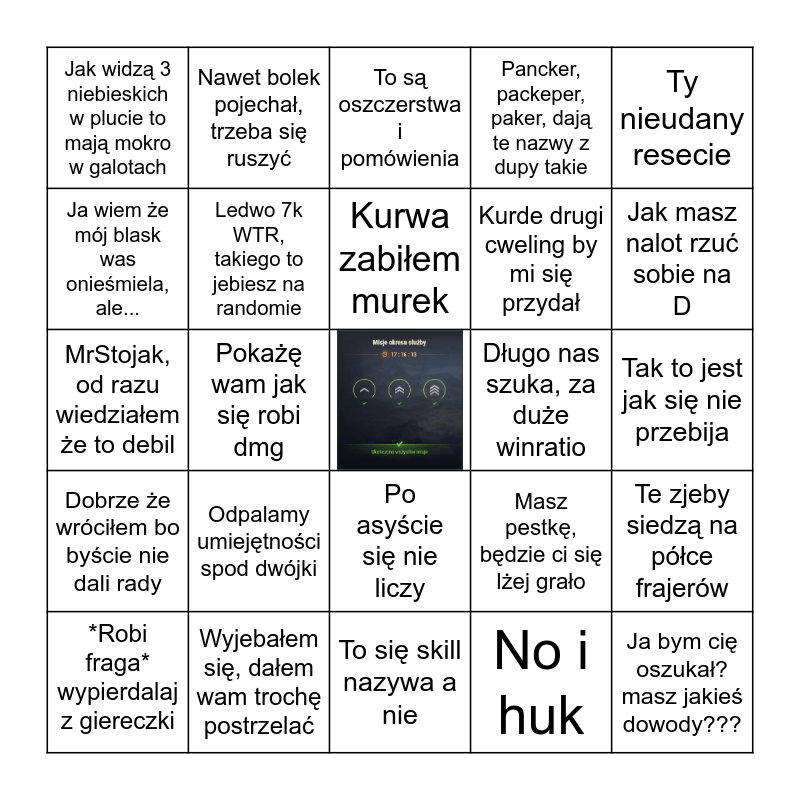 This bingo card has a free space and 24 words: *Robi fraga* wypierdalaj z giereczki, Odpalamy umiejętności spod dwójki, Kurwa zabiłem murek, No i huk, Ty nieudany resecie, Jak widzą 3 niebieskich w plucie to mają mokro w galotach, Nawet bolek pojechał, trzeba się ruszyć, To są oszczerstwa i pomówienia, Długo nas szuka, za duże winratio, Tak to jest jak się nie przebija, MrStojak, od razu wiedziałem że to debil, Ledwo 7k WTR, takiego to jebiesz na randomie, Masz pestkę, będzie ci się lżej grało, Te zjeby siedzą na półce frajerów, Ja wiem że mój blask was onieśmiela, ale..., Wyjebałem się, dałem wam trochę postrzelać, To się skill nazywa a nie, Pancker, packeper, paker, dają te nazwy z dupy takie, Jak masz nalot rzuć sobie na D, Dobrze że wróciłem bo byście nie dali rady, Pokażę wam jak się robi dmg, Po asyście się nie liczy, Kurde drugi cweling by mi się przydał and Ja bym cię oszukał? masz jakieś dowody???.