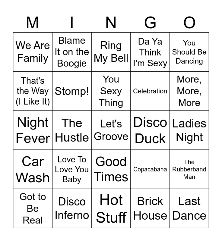 This bingo card has 30 words: Disco Inferno, Stayin' Alive, The Hustle, Boogie Nights, We Are Family, Ring My Bell, Stomp!, Good Times, Disco Duck, Hot Stuff, Ladies Night, Let's Groove, Brick House, Last Dance, More, More, More, Can't Get Enough of Your Love, Copacabana, Car Wash, Love To Love You Baby, You Should Be Dancing, Night Fever, Bad Girls, Blame It on the Boogie, Celebration, That's the Way (I Like It), Da Ya Think I'm Sexy, The Rubberband Man, Got to Be Real, You Sexy Thing and Shake Your Grove Thing.