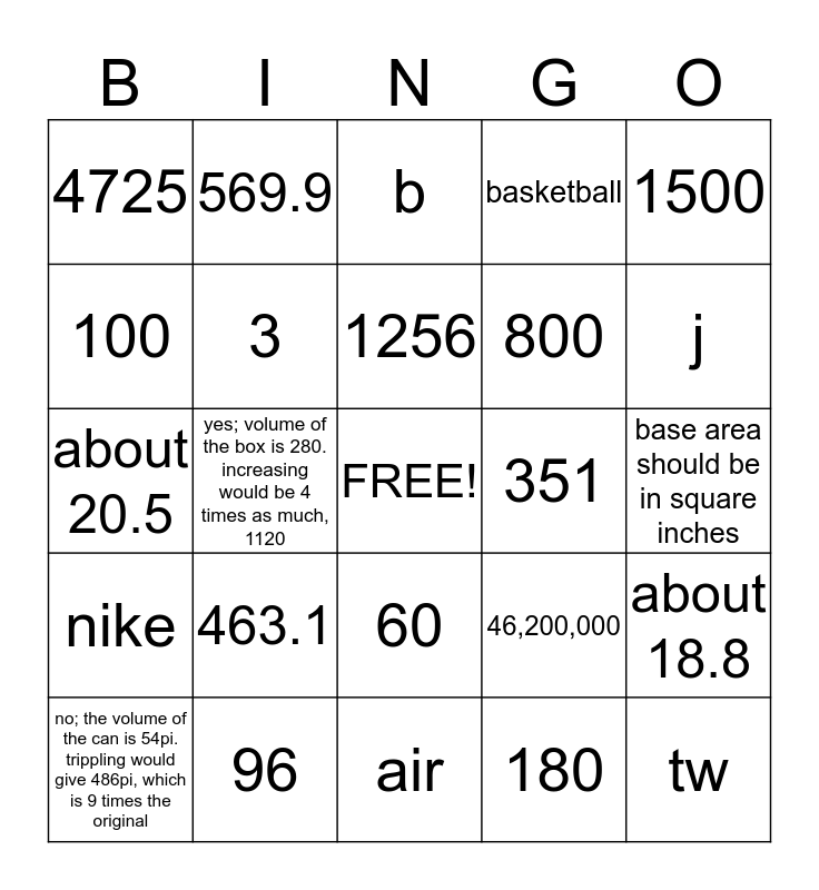 This bingo card has a free space and 24 words: 463.1, 96, 1256, no; the volume of the can is 54pi. trippling would give 486pi, which is 9 times the original, 1500, 4725, 100, 569.9, 351, 60, 800, about 20.5, 46,200,000, about 18.8, 3, 180, base area should be in square inches, b, j, yes; volume of the box is 280. increasing would be 4 times as much, 1120, tw, nike, basketball and air.