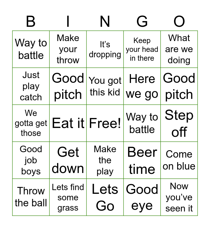 This bingo card has a free space and 29 words: Atta baby, Lets find some grass, It’s dropping, Get dirty, What are we doing, Way to battle, Good pitch, You got this kid, Way to battle, Come on blue, Throw the ball, Eat it, Good eye, Now you’ve seen it, We gotta get those, Way to be a wall, Lets Go, Beer time, Good pitch, Good job boys, Get down, Runner, Here we go, Step off, Just play catch, Make your throw, Make the play, Keep your head in there and Take a deep breath.