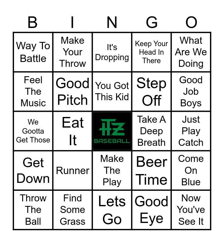 This bingo card has a free space and 29 words: Atta Baby, Find Some Grass, It's Dropping, Get Dirty, What Are We Doing, Way To Battle, Good Pitch, You Got This Kid, Take A Deep Breath, Come On Blue, Throw The Ball, Eat It, Good Eye, Now You've See It, We Gootta Get Those, Way To Be A Wall, Lets Go, Beer Time, Good Job Boys, Get Down, Runner, Here We Go, Step Off, Just Play Catch, Feel The Music, Make Your Throw, Make The Play, Keep Your Head In There and Swing The Bat.