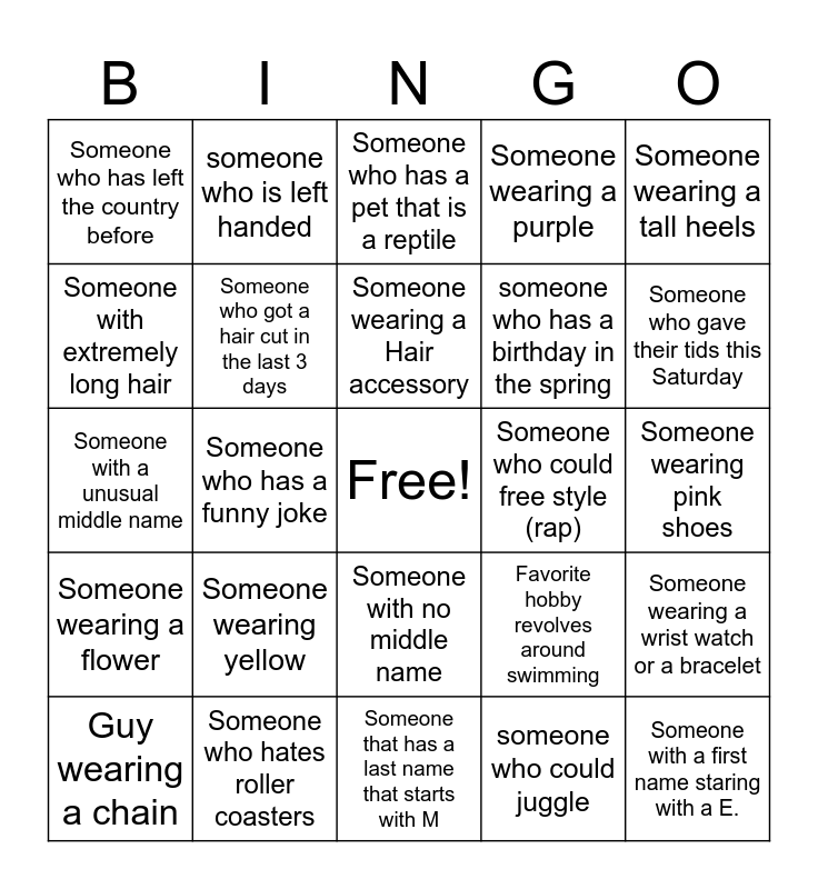 This bingo card has a free space and 24 words: Someone wearing yellow, Someone who hates roller coasters, Someone wearing a Hair accessory, Guy wearing a chain, Someone wearing a tall heels, Someone who has left the country before, Someone with extremely long hair, someone who is left handed, Someone who could free style (rap), Someone with no middle name, someone who has a birthday in the spring, Someone with a unusual middle name, Favorite hobby revolves around swimming, Someone wearing a wrist watch or a bracelet, Someone who got a hair cut in the last 3 days, someone who could juggle, Someone wearing pink shoes, Someone who has a pet that is a reptile, Someone who gave their tids this Saturday, Someone who has a funny joke, Someone with a first name staring with a E., Someone wearing a flower, Someone wearing a purple and Someone that has a last name that starts with M.