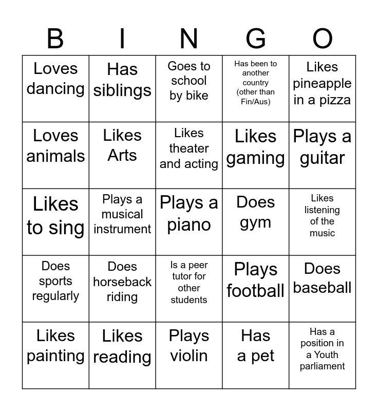 This bingo card has a free space and 24 words: Does horseback riding, Likes reading, Likes theater and acting, Likes painting, Likes pineapple in a pizza, Loves dancing, Loves animals, Has siblings, Does gym, Is a peer tutor for other students, Likes gaming, Likes to sing, Plays football, Does baseball, Likes Arts, Has a pet, Likes listening of the music, Goes to school by bike, Plays a guitar, Plays a musical instrument, Has a position in a Youth parliament, Does sports regularly, Has been to another country (other than Fin/Aus) and Plays violin.