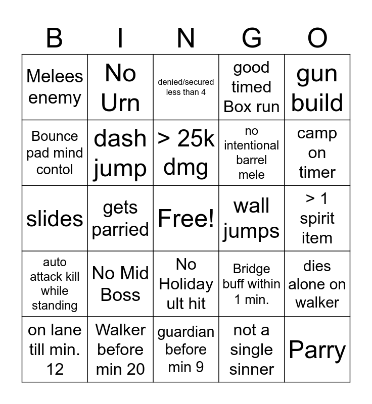 This bingo card has a free space and 24 words: No Mid Boss, Walker before min 20, > 25k dmg, on lane till min. 12, gun build, Melees enemy, Bounce pad mind contol, No Urn, wall jumps, No Holiday ult hit, no intentional barrel mele, slides, Bridge buff within 1 min., dies alone on walker, dash jump, not a single sinner, > 1 spirit item, denied/secured less than 4, camp on timer, gets parried, Parry, auto attack kill while standing, good timed Box run and guardian before min 9.