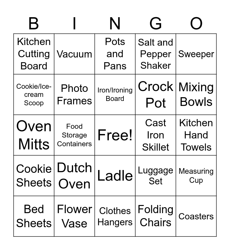 This bingo card has a free space and 30 words: Flower Vase, Bath Towels, Food Storage Containers, Coffee and Espresso Machine, Kitchen Cutting Board, Pots and Pans, Photo Frames, Ladle, Cast Iron Skillet, Clothes Hangers, Kitchen Hand Towels, Coasters, Folding Chairs, Clothes Hamper, Mixing Bowls, Spatula Set, Luggage Set, Cookie Sheets, Dutch Oven, Sweeper, Oven Mitts, Silverware Set, Vacuum, Crock Pot, Cookie/Ice-cream Scoop, Salt and Pepper Shaker, Measuring Cup, Bed Sheets, Iron/Ironing Board and Diffuser.