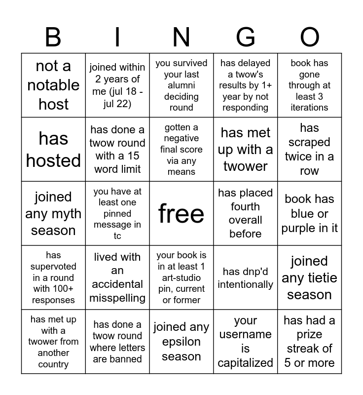 This bingo card has a free space and 24 words: lived with an accidental misspelling, has done a twow round where letters are banned, gotten a negative final score via any means, has met up with a twower from another country, book has gone through at least 3 iterations, not a notable host, has hosted, joined within 2 years of me (jul 18 - jul 22), has placed fourth overall before, your book is in at least 1 art-studio pin, current or former, has met up with a twower, joined any myth season, has dnp'd intentionally, joined any tietie season, has done a twow round with a 15 word limit, your username is capitalized, book has blue or purple in it, you survived your last alumni deciding round, has scraped twice in a row, you have at least one pinned message in tc, has had a prize streak of 5 or more, has supervoted in a round with 100+ responses, has delayed a twow's results by 1+ year by not responding and joined any epsilon season.