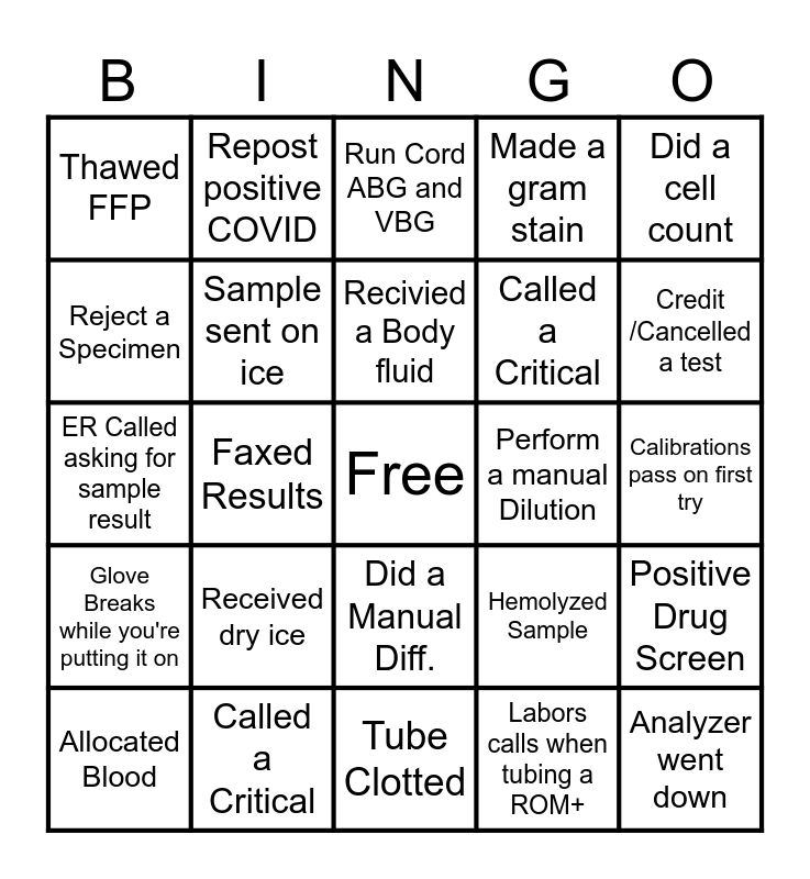 This bingo card has a free space and 29 words: Allocated Blood, Received a Sample, Faxed Results, Fridge Alarm goes off, Thawed FFP, Run Cord ABG and VBG, Sample sent on ice, Received dry ice, Perform a manual Dilution, Called a Critical, Calibrations pass on first try, Analyzer went down, Tube Clotted, Labors calls when tubing a ROM+, Credit /Cancelled a test, Lost a pen, Did a Manual Diff., Glove Breaks while you're putting it on, Did a cell count, ER Called asking for sample result, Hemolyzed Sample, Racked Samples, Called a Critical, Reject a Specimen, Made a gram stain, Repost positive COVID, Positive Drug Screen, Recivied a Body fluid and Ran a VBG.