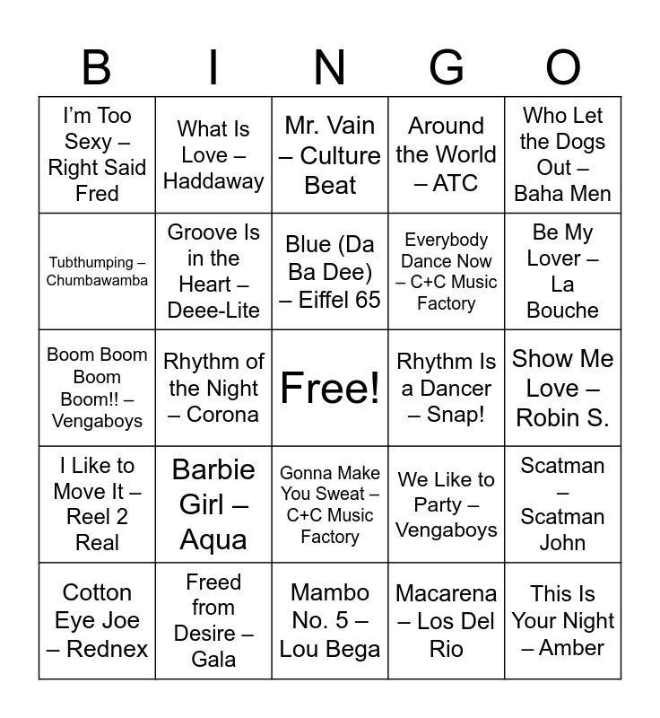 This bingo card has a free space and 25 words: Barbie Girl – Aqua, Mambo No. 5 – Lou Bega, Blue (Da Ba Dee) – Eiffel 65, Cotton Eye Joe – Rednex, Who Let the Dogs Out – Baha Men, I’m Too Sexy – Right Said Fred, Tubthumping – Chumbawamba, What Is Love – Haddaway, Rhythm Is a Dancer – Snap!, Gonna Make You Sweat – C+C Music Factory, Everybody Dance Now – C+C Music Factory, Boom Boom Boom Boom!! – Vengaboys, We Like to Party – Vengaboys, Scatman – Scatman John, Groove Is in the Heart – Deee-Lite, Finally – CeCe Peniston, Show Me Love – Robin S., Mr. Vain – Culture Beat, Be My Lover – La Bouche, Rhythm of the Night – Corona, This Is Your Night – Amber, Freed from Desire – Gala, I Like to Move It – Reel 2 Real, Around the World – ATC and Macarena – Los Del Rio.