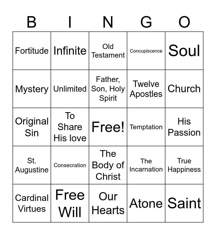 This bingo card has a free space and 77 words: Bible, Jesus, Old Testament, Communion, Virtue, Sin, God, Blessed Trinity, Faith, Hope, Charity, Holy, Father, Son, Holy Spirit, Mystery, Rested, To Share His love, Guardian, Saint, Nothing, Soul, Devil, Original Sin, Unlimited, Infinite, Concupiscence, Harmony, Savior, Pentecost, Covenant, Idol, Ten Commandents, Vices, Repent, The Incarnation, Church, Twelve Apostles, Priest, Bishops, Pope, Spiritual Kingdom, His Passion, Atone, Redeem, Sanctifying Grace, Holy Spirit, Child of God, Resurrection, Courage, Cardinal Virtues, Fortitude, Justice, Temprance, Prudence, The Body of Christ, Liturgy of the Word & Liturgy of the Eucharist, Ordinary Time, Liturgical Year, Seven, Sanctifying Grace, Everything, Healing, Absolution, Consecration, Transubstantiation, Lamb of God, Ten Commandments, How to Love God, How to Love Others, Virtue, Temptation, Act, Conscience, The Beatitudes, True Happiness, St. Augustine, Free Will, Our Hearts and Minds, Our Hearts and What is Best for Us.