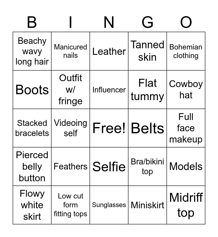 This bingo card has a free space and 24 words: Feathers, Low cut form fitting tops, Influencer, Flowy white skirt, Bohemian clothing, Beachy wavy long hair, Boots, Manicured nails, Belts, Selfie, Flat tummy, Stacked bracelets, Bra/bikini top, Models, Outfit w/ fringe, Miniskirt, Full face makeup, Leather, Cowboy hat, Videoing self, Midriff top, Pierced belly button, Tanned skin and Sunglasses.