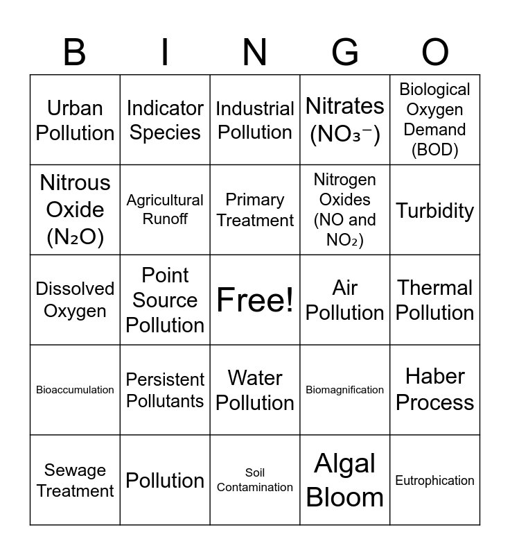 This bingo card has a free space and 30 words: Pollution, Pollutant, Point Source Pollution, Non-Point Source Pollution, Urban Pollution, Industrial Pollution, Agricultural Runoff, Water Pollution, Air Pollution, Soil Contamination, Thermal Pollution, Eutrophication, Algal Bloom, Sedimentation, Turbidity, Heavy Metal Contamination, Biomagnification, Bioaccumulation, Persistent Pollutants, Biological Oxygen Demand (BOD), Dissolved Oxygen, Hypoxia, Indicator Species, Nitrogen Oxides (NO and NO₂), Nitrous Oxide (N₂O), Nitrates (NO₃⁻), Haber Process, Sewage Treatment, Primary Treatment and Circular Economy.