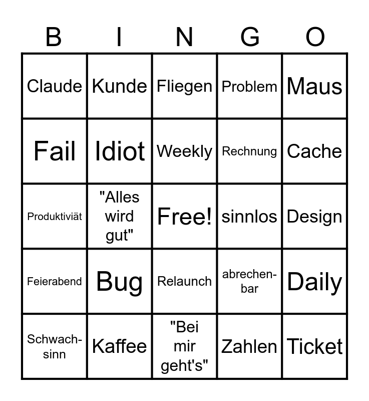 This bingo card has a free space and 24 words: Bug, Kaffee, Weekly, Schwach-sinn, Maus, Claude, Fail, Kunde, sinnlos, Relaunch, Rechnung, Produktiviät, abrechen-bar, Daily, Idiot, Zahlen, Design, Fliegen, Cache, "Alles wird gut", Ticket, Feierabend, Problem and "Bei mir geht's".