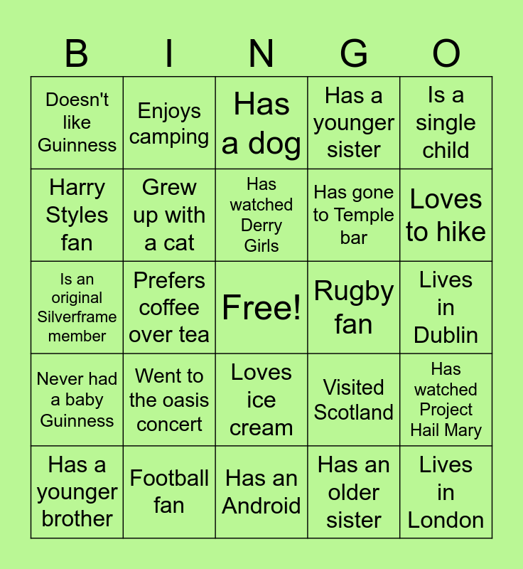 This bingo card has a free space and 29 words: Has a younger brother, Has been to Italy, Prefers coffee over tea, Prefers tea over coffee, Doesn't like Guinness, Has a dog, Grew up with a cat, Went to the oasis concert, Rugby fan, Football fan, Lives in Dublin, Lives in London, Has an Android, Has an older sister, Loves to hike, Has been to the cliffs of Moher, Loves ice cream, Never had a baby Guinness, Is a single child, Is an original Silverframe member, Visited Scotland, Has an iphone, Has gone to Temple bar, Harry Styles fan, Has a younger sister, Enjoys camping, Has watched Project Hail Mary, Has watched Derry Girls and Has an iphone.