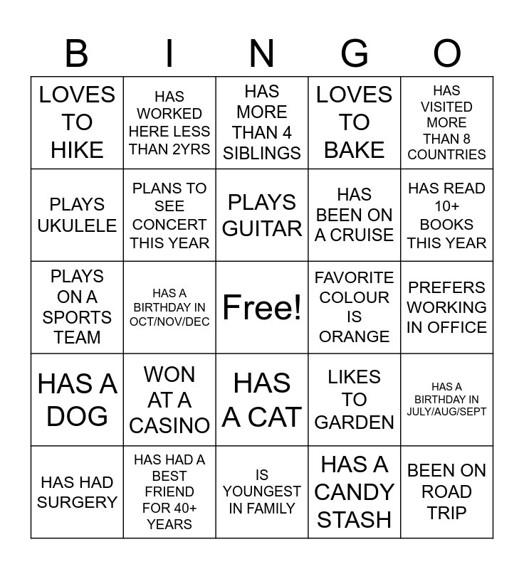 This bingo card has a free space and 34 words: BEEN ON A TRAIN, PLANE & CRUISE, HAS A CANDY STASH, FAVORITE HOLIDAY IS ST. PATRICK'S DAY, HAS A BIRTHDAY IN JAN/FEB/MAR, HAS A DOG, PLANS TO SEE CONCERT THIS YEAR, HAS VISITED MORE THAN 8 COUNTRIES, HAS HAD SURGERY, HAS WORKED HERE LESS THAN 2YRS, IS OLDEST IN FAMILY, PLAYS GUITAR, HAS MORE THAN 4 SIBLINGS, HAS WON AN AWARD, CAN SPEAK 3+ LANGUAGES, FAVORITE COLOUR IS ORANGE, HAS READ 10+ BOOKS THIS YEAR, HAS HAD A BEST FRIEND FOR 40+ YEARS, PLAYS ON A SPORTS TEAM, WON AT A CASINO, LIKES TO GARDEN, HAS A CAT, WORKED HERE 25+ YRS, LOVES TO HIKE, PREFERS WORKING IN OFFICE, IS YOUNGEST IN FAMILY, BEEN ON ROAD TRIP, LOVES TO BAKE, HAS PETS OTHER THAN DOGS OR CATS, HAS BEEN ON A CRUISE, PLAYS UKULELE, PLAYS DRUMS, HAS A BIRTHDAY IN OCT/NOV/DEC, HAS A BIRTHDAY IN JULY/AUG/SEPT and HAS A BIRTHDAY IN APR/MAY/JUNE.