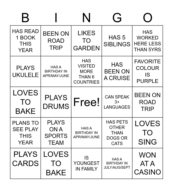 This bingo card has a free space and 36 words: BEEN ON A TRAIN, HAS A CANDY STASH, FAVORITE HOLIDAY IS HALLOWEEN, HAS A BIRTHDAY IN APR/MAY/JUNE, HAS PETS OTHER THAN DOGS OR CATS, PLANS TO SEE PLAY THIS YEAR, HAS VISITED MORE THAN 6 COUNTRIES, HAS HAD A BROKEN BONE, HAS WORKED HERE LESS THAN 5YRS, IS MIDDLE CHILD IN FAMILY, PLAYS DRUMS, HAS 5 SIBLINGS, HAS BEEN ON A CRUISE, CAN SPEAK 3+ LANGUAGES, FAVORITE COLOUR IS PURPLE, HAS READ 1 BOOK THIS YEAR, HAS HAD A BEST FRIEND FOR 40+ YEARS, PLAYS ON A SPORTS TEAM, WON AT A CASINO, LIKES TO GARDEN, BEEN ON ROAD TRIP, LOVES TO SING, LOVES TO BAKE, PLAYS CARDS, IS YOUNGEST IN FAMILY, BEEN ON ROAD TRIP, LOVES TO BAKE, HAS PETS OTHER THAN DOGS OR CATS, HAS BEEN ON A CRUISE, PLAYS UKULELE, PLAYS DRUMS, HAS A BIRTHDAY IN OCT/NOV/DEC, HAS A BIRTHDAY IN JULY/AUG/SEPT, HAS A BIRTHDAY IN APR/MAY/JUNE, WORKED HERE 25+ YRS and HAS A CAT.