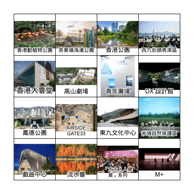 This bingo card has 16 images and 16 words: 流水響, 米埔自然保護區, 香港公園, 香港動植物公園, 鳳德公園, 茶果嶺海濱公園, 東九文化中心, 「太古人人樂賞」系列, 香港大會堂, 高山劇場, 戲曲中心, 西九街頭表演區, AIRSIDE GATE33, DX 設計館, 青年廣場 and M+.
