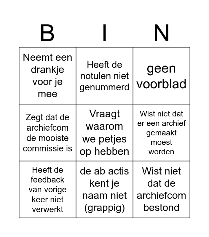 This bingo card has 12 words: Geen hyperlinks in archief, Wist niet dat de archiefcom bestond, Vraagt waarom we petjes op hebben, Wist niet dat er een archief gemaakt moest worden, Heeft de notulen niet genummerd, geen voorblad, de ab actis kent je naam niet (grappig), laptop vergeten, Neemt een drankje voor je mee, Zegt dat de archiefcom de mooiste commissie is, Heeft de feedback van vorige keer niet verwerkt and "ja ik had het een beetje druk".