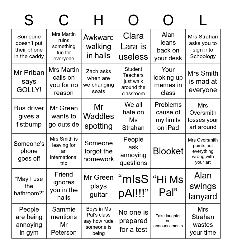 This bingo card has 36 words: “mIsS pAl!!!”, Mr Green plays guitar, No one is prepared for a test, Mr Priban says GOLLY!, Someone’s phone goes off, We all hate on Ms Strahan, Mrs Martin calls on you for no reason, Boys in Ms Pal’s class say how rude someone is being, Alan leans back on your desk, “Hi Ms Pal”, Mrs Smith is mad at everyone, Clara Lara is useless, Alan swings lanyard, Mr Green wants to go outside, Student Teachers just walk around the classroom, Someone doesn’t put their phone in the caddy, “May I use the bathroom?”, Problems cause of my limits on iPad, Bus driver gives a fistbump, Awkward walking in halls, Mr Waddles spotting, Mrs Smith is leaving for an international trip, People ask annoying questions, Someone forgot the homework, Blooket, Mrs Martin ruins something fun for everyone, Your looking up memes in class, Sammie mentions Mr Peterson, Zach asks when are we changing seats, Mrs Strahan asks you to sign into Schoology, Mrs Strahan wastes your time, People are being annoying in gym, Mrs Oversmith points out everything wrong with your art, Mrs Oversmith tosses your art around, Friend ignores you in the halls and Fake laughter on announcements.