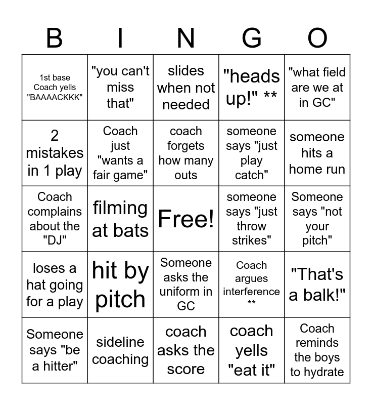 This bingo card has a free space and 27 words: Coach argues interference **, Coach calls over the UIC, someone says "just play catch", coach asks the score, 2 mistakes in 1 play, slides when not needed, "you can't miss that", loses a hat going for a play, someone says "just throw strikes", "That's a balk!", Coach complains about the "DJ", "heads up!" **, Someone says "be a hitter", sideline coaching, someone hits a home run, Someone says "no one better", Coach just "wants a fair game", coach forgets how many outs, hit by pitch, 1st base Coach yells "BAAAACKKK", Someone says "not your pitch", coach yells "eat it", filming at bats, Coach reminds the boys to hydrate, Someone asks the uniform in GC, "what field are we at in GC" and "running late in GC".