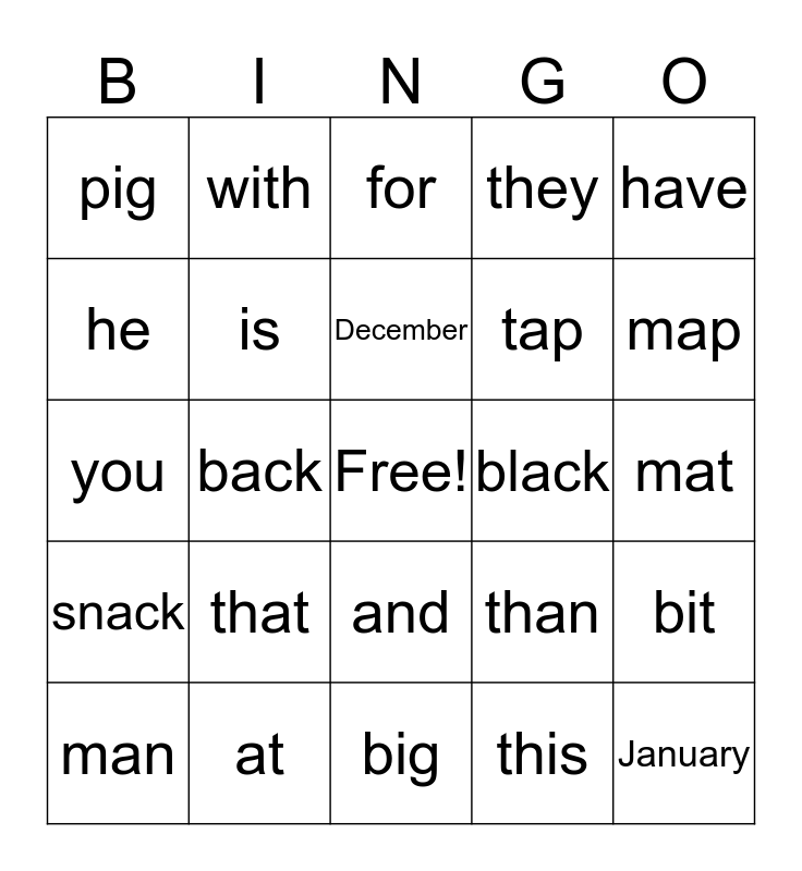 This bingo card has a free space and 24 words: that, at, December, man, have, pig, he, with, black, and, tap, you, than, bit, is, this, mat, for, map, back, January, snack, they and big.