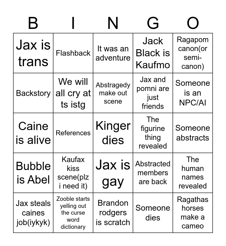 This bingo card has a free space and 24 words: Kaufax kiss scene(plz i need it), Zooble starts yelling out the curse word dictionary, Abstragedy make out scene, Jax steals caines job(iykyk), Ragapom canon(or semi-canon), Jax is trans, Backstory, Flashback, The figurine thing revealed, Jax is gay, Jax and pomni are just friends, Caine is alive, Abstracted members are back, The human names revealed, We will all cry at ts istg, Someone dies, Someone abstracts, It was an adventure, Someone is an NPC/AI, References, Ragathas horses make a cameo, Bubble is Abel, Jack Black is Kaufmo and Brandon rodgers is scratch.