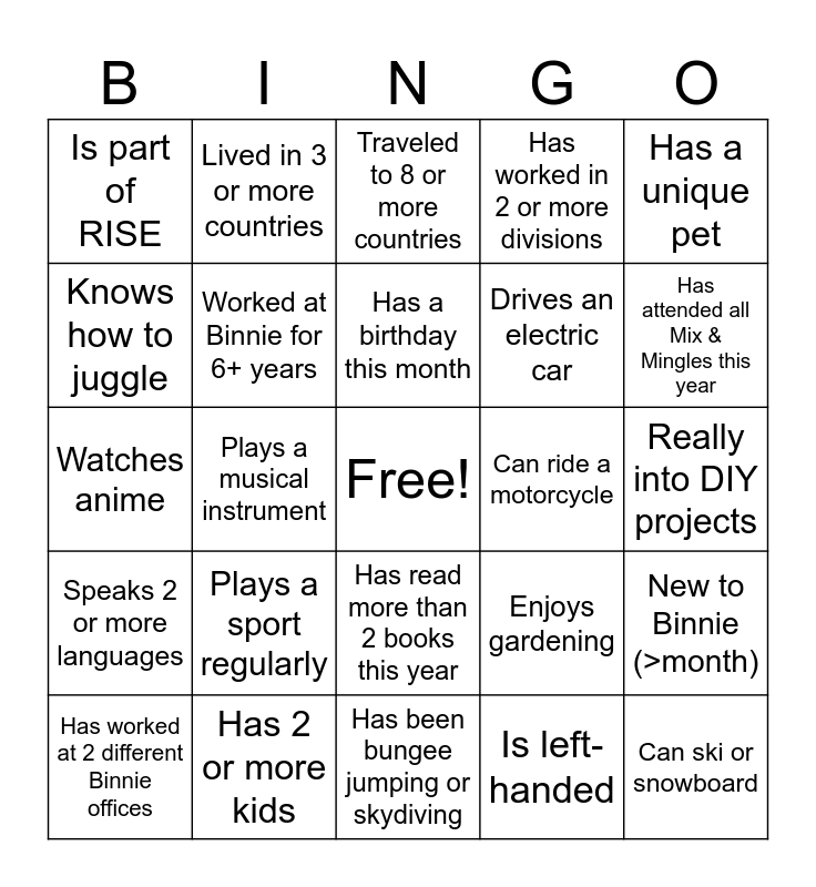 This bingo card has a free space and 32 words: Is left-handed, Is part of YP, Plays a musical instrument, Can do a cartwheel, Speaks 2 or more languages, Worked at Binnie for 6+ years, Has a unique pet, New to Binnie (>month), Lived in 3 or more countries, Worked in 2 or more countries, Has a birthday this month, Traveled to 8 or more countries, Has a selfie with someone famous, Can moonwalk, Can ride a motorcycle, Ran the Sun Run, Has worked at 2 different Binnie offices, Watches anime, Has read more than 2 books this year, Plays a sport regularly, Enjoys gardening, Has an embarrassing school picture, Really into DIY projects, Has 2 or more kids, Can ski or snowboard, Has worked in 2 or more divisions, Drives an electric car, Knows how to juggle, Is part of RISE, Has been bungee jumping or skydiving, Cycles to work and Has attended all Mix & Mingles this year.