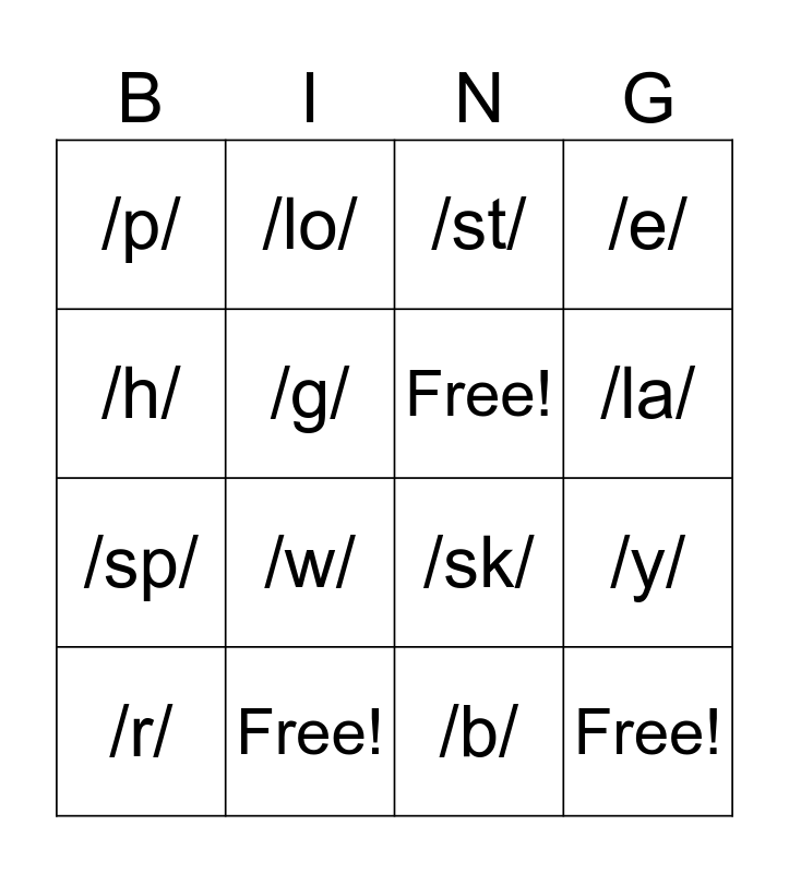 This bingo card has 16 words: Free!, /y/, /st/, /p/, /sp/, /lo/, /sk/, /b/, /h/, /g/, /r/, /e/, /w/, /la/, Free! and Free!.