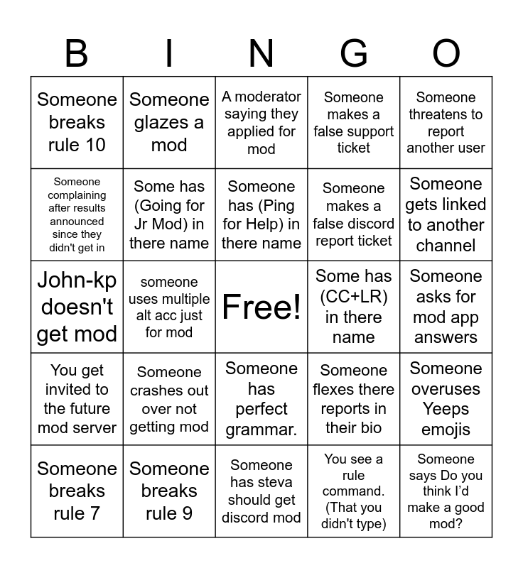 This bingo card has a free space and 34 words: Someone has (GL for Jr Mod) in there name, You see a rule command. (That you didn't type), Someone breaks rule 2, Someone has (future mod) in there name, You get invited to the future mod server, Some has (Going for Jr Mod) in there name, Someone threatens to report another user, Someone breaks rule 7, Someone glazes a mod, Someone breaks rule 14, Someone has (Ping for Help) in there name, A moderator saying they applied for mod, Someone flexes there mod app length, Someone gets falsed accused of breaking a rule, Some has (CC+LR) in there name, Someone gets linked to another channel, Someone breaks rule 9, John-kp doesn't get mod, Someone crashes out over not getting mod, Someone flexes there reports in their bio, Someone has perfect grammar., Someone asks for their mod app to be rated, Someone breaks rule 10, Someone asks for mod app answers, Someone has steva should get discord mod, Someone says Do you think I’d make a good mod?, Someone makes a false support ticket, Someone makes a false roles missing ticket, Someone makes a false discord report ticket, Someone complaining after results announced since they didn't get in, Someone Pings Devs asking for free mod, someone uses multiple alt acc just for mod, Someone overuses Yeeps emojis and Someone asks for there ticket to be done.