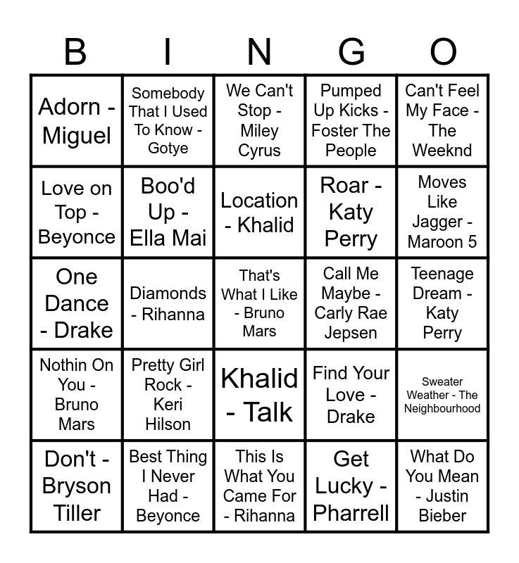 This bingo card has 30 words: Best Thing I Never Had - Beyonce, Rolling In The Deep - Adele, Diamonds - Rihanna, Grenade - Bruno Mars, Adorn - Miguel, We Can't Stop - Miley Cyrus, Boo'd Up - Ella Mai, Khalid - Talk, Call Me Maybe - Carly Rae Jepsen, This Is What You Came For - Rihanna, Teenage Dream - Katy Perry, That's What I Like - Bruno Mars, Get Lucky - Pharrell, What Do You Mean - Justin Bieber, Moves Like Jagger - Maroon 5, Fun. - We Are Young, Find Your Love - Drake, Nothin On You - Bruno Mars, Pretty Girl Rock - Keri Hilson, Can't Feel My Face - The Weeknd, One Dance - Drake, Latch - Sam Smith, Somebody That I Used To Know - Gotye, Roar - Katy Perry, Love on Top - Beyonce, Pumped Up Kicks - Foster The People, Sweater Weather - The Neighbourhood, Don't - Bryson Tiller, Location - Khalid and Forget You - CeeLo Green.