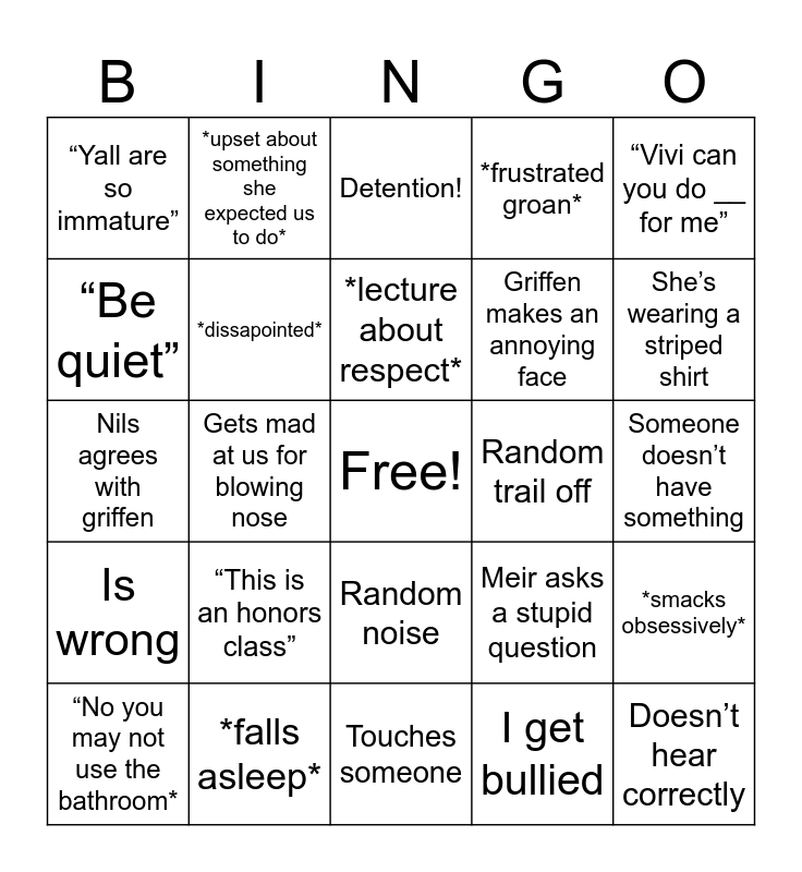 This bingo card has a free space and 24 words: “This is an honors class”, *falls asleep*, *lecture about respect*, “No you may not use the bathroom*, “Vivi can you do __ for me”, “Yall are so immature”, “Be quiet”, *upset about something she expected us to do*, Random trail off, Random noise, Griffen makes an annoying face, Nils agrees with griffen, Meir asks a stupid question, *smacks obsessively*, *dissapointed*, I get bullied, Someone doesn’t have something, Detention!, She’s wearing a striped shirt, Gets mad at us for blowing nose, Doesn’t hear correctly, Is wrong, *frustrated groan* and Touches someone.