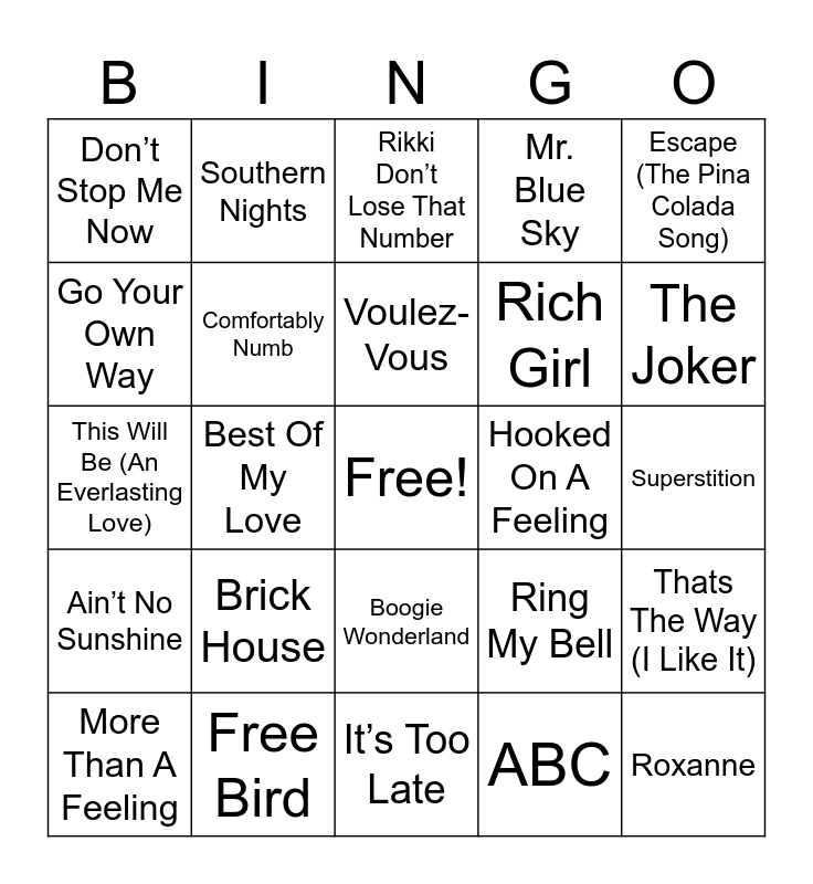 This bingo card has a free space and 35 words: Piano Man, Stayin’ Alive, Come Sail Away, Comfortably Numb, Boogie Wonderland, Mr. Blue Sky, Go Your Own Way, Band On The Run, Voulez-Vous, Got To Be Real, This Will Be (An Everlasting Love), Escape (The Pina Colada Song), What You Won’t Do For Love, Copacabana (At The Copa), Don’t Stop Me Now, Hooked On A Feeling, ABC, Best Of My Love, Ain’t No Sunshine, Roxanne, Ring My Bell, More Than A Feeling, Thats The Way (I Like It), Free Bird, Rikki Don’t Lose That Number, The Joker, Low Rider, Sweet Home Alabama, Rich Girl, Superstition, I WIll Survive, It’s Too Late, Brick House, Southern Nights and Don’t Do Me Like That.