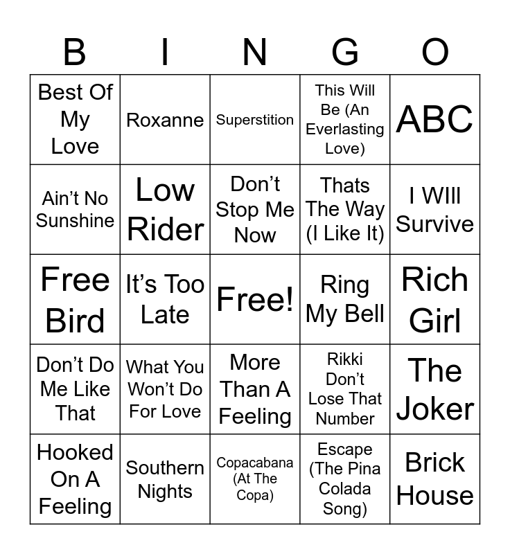 This bingo card has a free space and 25 words: What You Won’t Do For Love, Copacabana (At The Copa), Don’t Stop Me Now, Hooked On A Feeling, ABC, Best Of My Love, Ain’t No Sunshine, Roxanne, Ring My Bell, More Than A Feeling, Thats The Way (I Like It), Free Bird, Rikki Don’t Lose That Number, The Joker, Low Rider, Sweet Home Alabama, Rich Girl, Superstition, I WIll Survive, It’s Too Late, Brick House, Southern Nights, Don’t Do Me Like That, This Will Be (An Everlasting Love) and Escape (The Pina Colada Song).