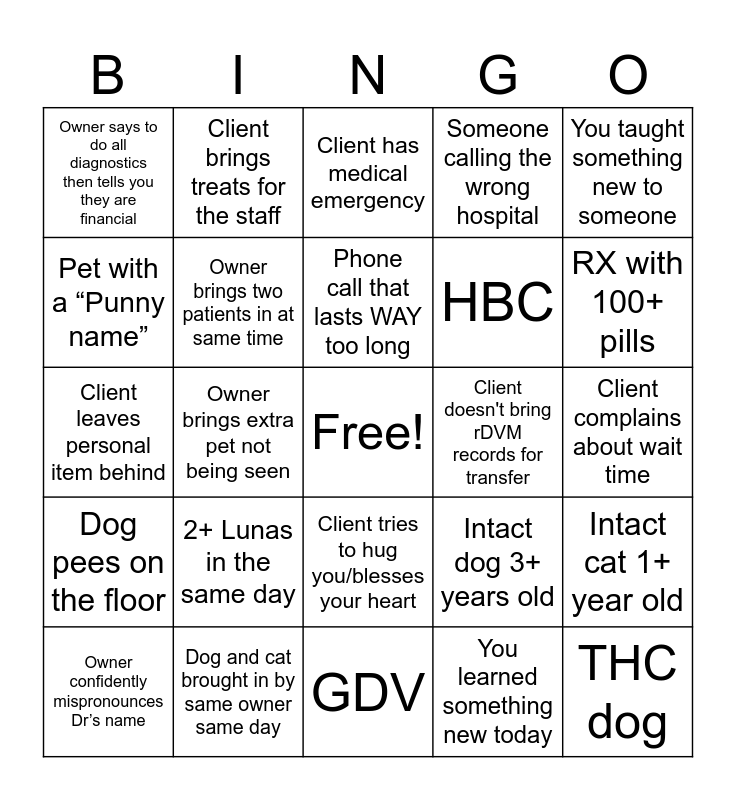 This bingo card has a free space and 39 words: 50kg+ dog, 10kg + cat, Owner needs Rx today, Intact dog 3+ years old, Intact cat 1+ year old, Dog pees on the floor, Owner brings extra pet not being seen, Client refuses to transfer pet to SAH, Client doesn't bring rDVM records for transfer, Client complains about wait time, Pet with a “Punny name”, Client brings treats for the staff, 5+ cats in the same day, RX with 100+ pills, Client leaves personal item behind, 2+ Lunas in the same day, Client tries to hug you/blesses your heart, Someone calling the wrong hospital, Cat with no carrier, Owner confidently mispronounces Dr’s name, Owner brings two patients in at same time, Phone call that lasts WAY too long, You learned something new today, You taught something new to someone, Dog named Buddy, Max, or Bella, Dog and cat brought in by same owner same day, GDV, Hematochezia, Staff pet comes in, Owner says to do all diagnostics then tells you they are financial, Good Sam brings in stray kitten(s), Patient comes in for PC, Patient ends up in Urgent Care, HBC, THC dog, Owner tries to show you something on their body, Dog with no leash, Client has medical emergency, Owner doesn't believe in vaccines and Patient eats raw diet.