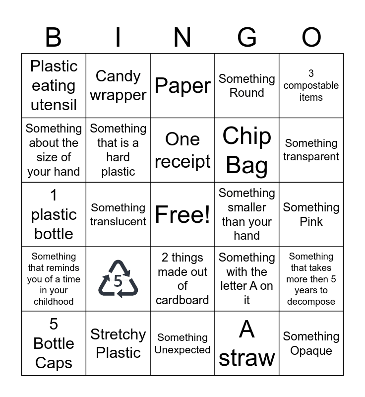 This bingo card has 1 images, a free space and 23 words: Stretchy Plastic, One receipt, 5 Bottle Caps, 3 compostable items, Plastic eating utensil, Something about the size of your hand, Candy wrapper, Something smaller than your hand, 2 things made out of cardboard, Chip Bag, 1 plastic bottle, Something with the letter A on it, Something that takes more then 5 years to decompose, Something that is a hard plastic, A straw, Something Pink, Paper, Something transparent, Something translucent, Something Opaque, Something that reminds you of a time in your childhood, Something Round and Something Unexpected.