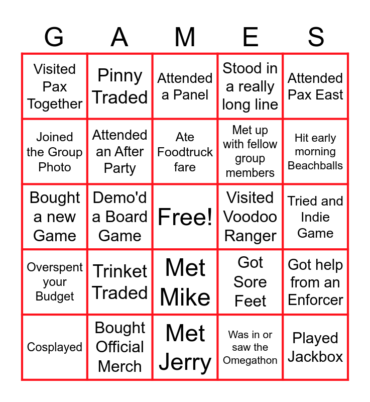 This bingo card has a free space and 39 words: Attended PaxU, Wish they brought bigger bags, Owns a Pinny, Attended an After Party, Cosplayed, Met Mike, Ate Foodtruck fare, Gotten a Free Shrug, Attended Pax East, Overspent your Budget, Demo'd a Board Game, Stood in a really long line, Played Jackbox, Tried and Indie Game, Visited Voodoo Ranger, Trinket Traded, Stopped Mid-Aisle for Cosplay pics, Visited Pax Together, Shopped at Cookie Brigade, Got Sore Feet, Joined the Group Photo, Met Jerry, Met up with fellow group members, Hit early morning Beachballs, Got Free Aerthings, Ate Trolli Worms, Demo'd Halloween, Played a Nintendo Game, Took a Selfie by the "X", Pinny Traded, Played a Game in Freeplay, Painted a Mini, Attended a Panel, Bought Official Merch, Was in or saw the Omegathon, Played an Arcade Game, Got help from an Enforcer, Bought a new Game and Played Magic.
